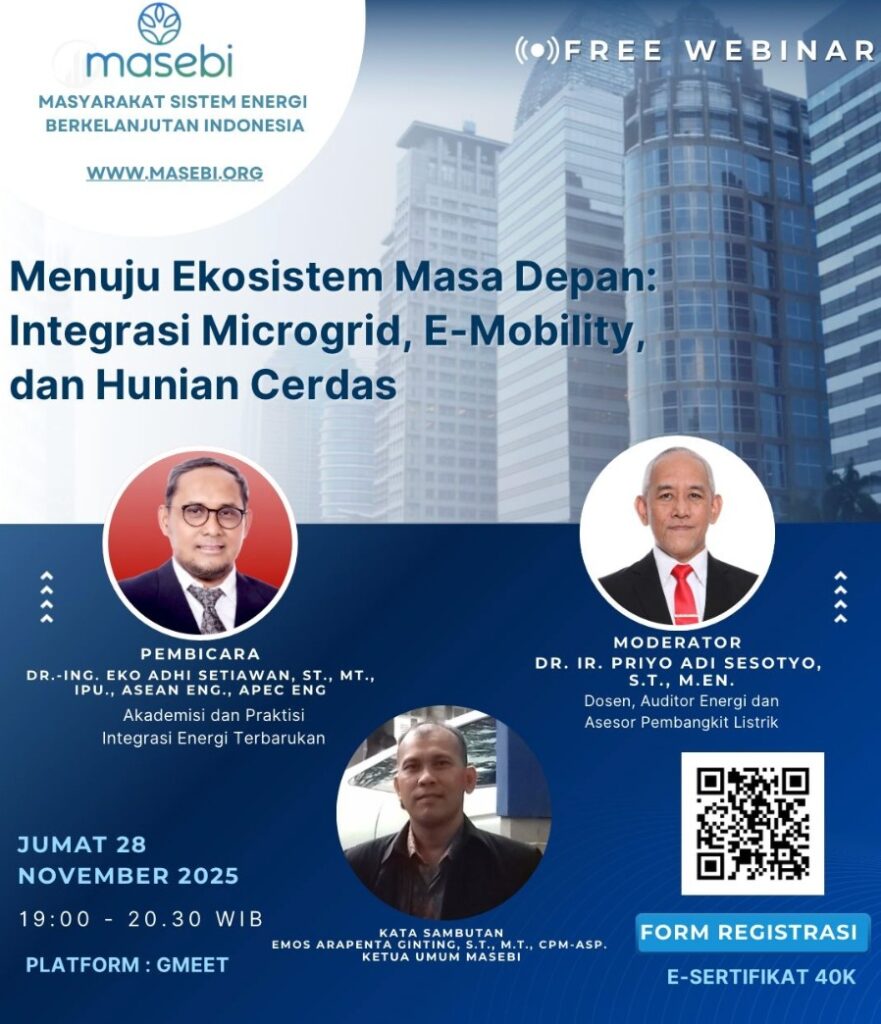 Gradienta kembali memperkuat posisinya sebagai pelopor transisi energi berbasis masyarakat di Indonesia. Pada Jumat, 28 November 2025, Dr.-Ing. Eko Adhi Setiawan, IPU, APEC Eng., pendiri Gradienta, tampil sebagai pembicara utama dalam webinar nasional bertajuk “Menuju Ekosistem Masa Depan: Integrasi Grid, E-Mobility, dan Hunian Cerdas” yang diselenggarakan oleh Masyarakat Sistem Energi Berkelanjutan Indonesia (MASEBI).